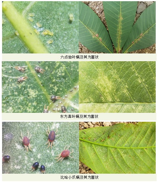 圖1 三種橡膠重要害螨及其為害狀