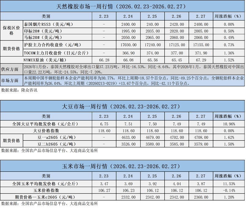 天然橡膠、大豆、玉米市場一周行情(2026.02.23-02.27)