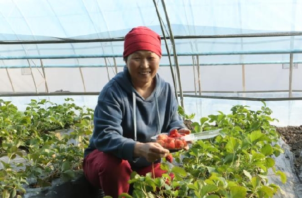 “把小果病果剪掉,讓果與果之間保留一定空間,減少養(yǎng)分流失,促進(jìn)果粒大小均勻、著色度好,提高草莓的品質(zhì)?!痹?2號(hào)溫室大棚內(nèi),幾個(gè)工人正忙碌地對(duì)草莓果子進(jìn)行修剪、疏果,技術(shù)指導(dǎo)孟憲民在一旁邊說邊示范,目前草莓正值盛產(chǎn)期,為了保證品質(zhì),每天他都會(huì)來草莓大棚“遛園”,讓草莓生長(zhǎng)達(dá)到最佳狀態(tài)。目前,大觀園的草莓處于成熟期,草莓個(gè)頭大、口感好,采摘價(jià)格在40元每斤,比市場(chǎng)上的草莓價(jià)格要高一些,但是因?yàn)榧t顏草莓口感香甜,贏得了不少采摘者前來享受“莓”好時(shí)光。