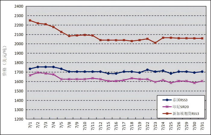 國外主產(chǎn)區(qū):7月,泰國RSS3平均價格為1712美元/噸,環(huán)比下跌672美元/噸,最高價為1755美元/噸,最低價為1685美元/噸;印尼SIR20平均價格為1625美元/噸,環(huán)比下跌98美元/噸,最高價為1695美元/噸,最低價為1585美元/噸;新加坡RSS3期貨主力合約月均結(jié)算價格為2087美元/噸,環(huán)比下跌226美元/噸,最高價為2249美元/噸,最低價為2011美元/噸。