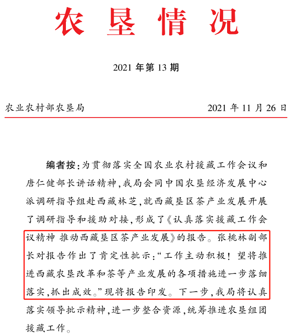 4.2021年10月,為貫徹落實全國農(nóng)業(yè)農(nóng)村援藏工作會議精神,經(jīng)濟(jì)貿(mào)易處牽頭組織調(diào)研組赴西藏開展專題調(diào)研。通過實地考察林芝市易貢茶場、察隅農(nóng)場等茶業(yè)種植區(qū),形成《認(rèn)真落實援藏工作會議精神 推動西藏墾區(qū)茶產(chǎn)業(yè)發(fā)展》調(diào)研報告,獲得張?zhí)伊指辈块L肯定性批示。