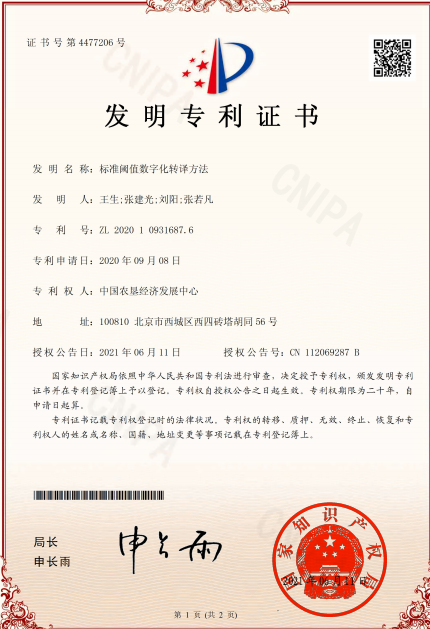 5. 2021年6月,信息服務(wù)處成功申請《標(biāo)準(zhǔn)閾值數(shù)字化轉(zhuǎn)譯方法》專利技術(shù),創(chuàng)造性地將產(chǎn)地環(huán)境標(biāo)準(zhǔn)、生產(chǎn)標(biāo)準(zhǔn)、產(chǎn)品標(biāo)準(zhǔn)等進(jìn)行數(shù)字化轉(zhuǎn)譯,將書面標(biāo)準(zhǔn)轉(zhuǎn)化為信息系統(tǒng)可識別的數(shù)字標(biāo)準(zhǔn),從而實現(xiàn)精準(zhǔn)質(zhì)量控制。目前已在多家農(nóng)墾企業(yè)的全面質(zhì)量管理數(shù)字化項目中應(yīng)用,涵蓋種植業(yè)、畜牧業(yè)、漁業(yè)等產(chǎn)業(yè),在推動企業(yè)智能化質(zhì)量安全監(jiān)管、提升產(chǎn)品質(zhì)量等方面發(fā)揮了巨大作用。