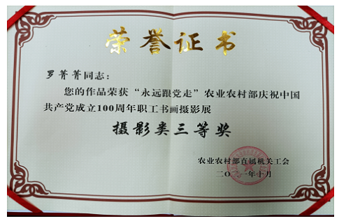 10. 在2021年農(nóng)業(yè)農(nóng)村部中青年干部交流論壇中,中國農(nóng)墾經(jīng)濟(jì)發(fā)展中心分獲專題二及專題三優(yōu)秀組織單位;青年同志累計投稿27篇,獲獎16項,其中,鐘鑫、桂丹、李瀟、馬晨雨、郭靜如、季剛獲得二等獎;許冠堂、郭靜如、季剛獲得三等獎;桂丹、羅菁菁、李晨萌、張若凡獲得優(yōu)秀獎;鐘鑫還獲得專題七演講比賽二等獎。在“永遠(yuǎn)跟黨走”農(nóng)業(yè)農(nóng)村部慶祝中國共產(chǎn)黨成立100周年職工書畫攝影展中,羅菁菁同志獲得“攝影類三等獎”。