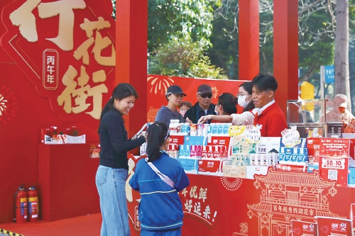 廣東農墾下屬燕塘乳業(yè)的展位上,工作人員忙碌著,將各類奶產品交到消費者手中。一旁的互動墻上展示著燕塘乳業(yè)的故事、廣州花市的記憶和新春寄語。燕塘乳業(yè)的產品還換上了“馬年新衣”,包裝上印著花街門樓牌坊、節(jié)日焰火、聯名百年西湖花市非遺標志,還有“掂過碌蔗”“家肥屋潤”“撈乜都掂”“豬籠入水”等吉祥俚語,讓奶產品成為承載年味的“文化名片”。市民購買“新春限定版”牛奶,也將美好寓意一同納入行囊。