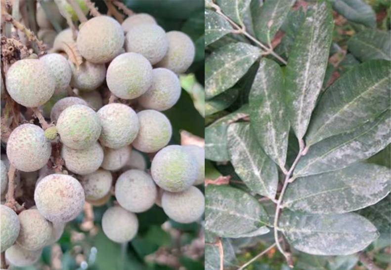 廣東與廣西是我國龍眼的重要主產(chǎn)區(qū),現(xiàn)正陸續(xù)進(jìn)入采收旺季。今年夏季持續(xù)高溫高濕,導(dǎo)致部分果園龍眼白霉病發(fā)生嚴(yán)重。該病主要為害接近成熟的龍眼果實(shí)及葉片,往往先發(fā)生在樹冠中下層枝葉稠密的果穗或葉片上。在果實(shí)上,病菌菌絲和孢子形成的一層白色霉?fàn)钗锟筛采w整個(gè)果實(shí)表面,導(dǎo)致部分果枝干枯和果實(shí)脫落或果皮暗褐色、果肉變質(zhì)腐爛;中度和輕度發(fā)病的果實(shí),雖果肉未腐爛,但品質(zhì)與風(fēng)味下降。受害葉片則正面覆蓋有一層白色霉?fàn)钗?,雖不形成壞死病斑,但引致葉片早衰。