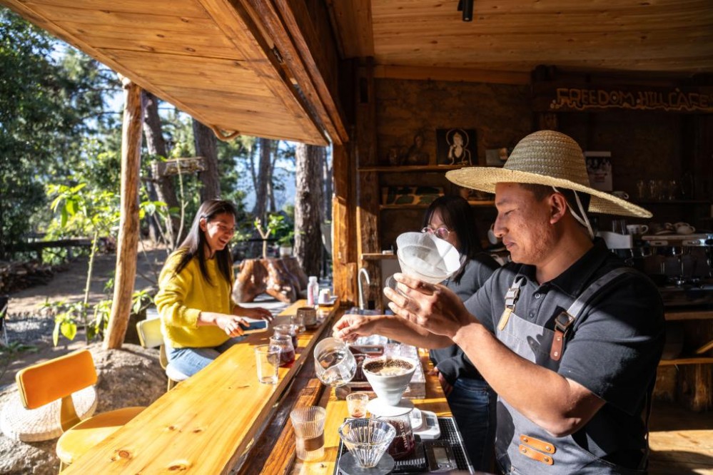 2026年1月23日,咖啡師(右)在云南省臨滄市臨翔區(qū)邦東鄉(xiāng)昔歸村昔歸咖啡莊園為顧客制作咖啡。新華社記者高詠薇 攝