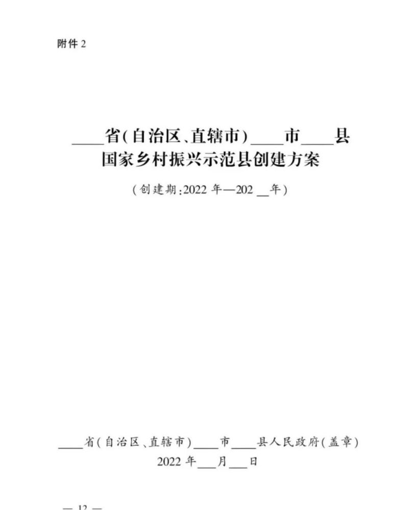 (一)創(chuàng)建程序。國家鄉(xiāng)村振興示范縣按照“縣級政府申請,市級部門擇優(yōu)遴選,省級部門審核并報省級政府同意,農(nóng)業(yè)農(nóng)村部、國家鄉(xiāng)村振興局批準創(chuàng)建”的程序,開展申報創(chuàng)建工作。各地嚴格按照《2022年鄉(xiāng)村振興示范創(chuàng)建名額分配表》(附件1)申報創(chuàng)建,超出指標數(shù)的不予受理。省級農(nóng)業(yè)農(nóng)村部門會同鄉(xiāng)村振興局,指導(dǎo)申報創(chuàng)建的縣級政府認真編制《國家鄉(xiāng)村振興示范縣創(chuàng)建方案》(附件2),經(jīng)省級人民政府同意后,報農(nóng)業(yè)農(nóng)村部、國家鄉(xiāng)村振興局。新疆生產(chǎn)建設(shè)兵團、計劃單列市、直屬墾區(qū)直接報農(nóng)業(yè)農(nóng)村部、國家鄉(xiāng)村振興局。請于8月30日前提交申報材料,其中紙質(zhì)申報材料一式3份,同步發(fā)送電子版至xczxc@agri.gov.cn(郵件標題注明:×省×縣申報國家鄉(xiāng)村振興示范縣材料),超期不予受理。