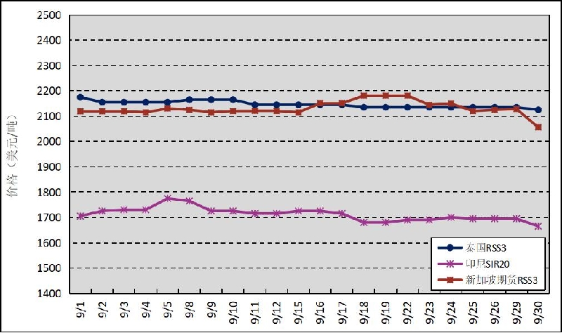 國(guó)外主產(chǎn)區(qū):9月,泰國(guó)RSS3平均價(jià)格為2146美元/噸,環(huán)比下跌40美元/噸,最高價(jià)為2175美元/噸,最低價(jià)為2125美元/噸;印尼SIR20平均價(jià)格為1712美元/噸,環(huán)比上漲30美元/噸,最高價(jià)為1775美元/噸,最低價(jià)為1665美元/噸;新加坡RSS3期貨主力合約月均結(jié)算價(jià)格為2131美元/噸,環(huán)比下跌36美元/噸,最高價(jià)為2181美元/噸,最低價(jià)為2056美元/噸。