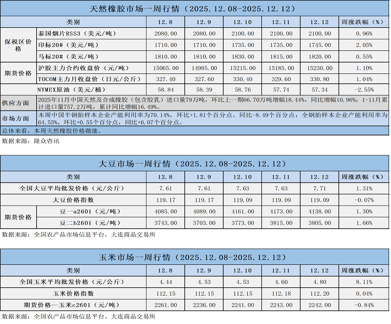 天然橡膠、大豆、玉米市場(chǎng)一周行情(2025.12.08-12.12)
