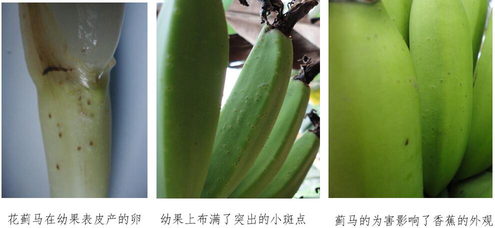 香蕉薊馬是一類寄居在花中的多食性害蟲,有多個(gè)種類,主要為香蕉花薊馬Thrips hawaiiensis。香蕉花一旦開始抽蕾,香蕉薊馬即由花苞肩部苞片間的裂縫處侵入,銼吸子房、小果汁液等幼嫩部位,在花蕾苞片完全張開時(shí)立即遷入到內(nèi)層或其它未張開苞片的花蕾內(nèi)繼續(xù)為害。其為害可使果皮組織增生、木栓化,受害部位在果實(shí)后期時(shí)變成突起的黑斑,嚴(yán)重影響果實(shí)的外觀品質(zhì),降低商品經(jīng)濟(jì)價(jià)值(圖)。防治關(guān)鍵點(diǎn)在于壓低蟲口密度,最佳用藥時(shí)期為香蕉現(xiàn)蕾后立即施藥防治,提前防止薊馬進(jìn)入花苞內(nèi)部。