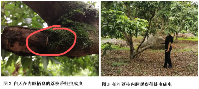 一、監(jiān)測方法:1.監(jiān)測落果中荔枝蒂蛀蟲的發(fā)育進(jìn)度,預(yù)測蒂蛀蟲成蟲羽化高峰期。根據(jù)蒂蛀蟲田間簡易測報方法(如圖1),連續(xù)7-10天撿拾地下落果,收集并用一層報紙包裹,數(shù)日后剪下在報紙化蛹的荔枝蒂蛀蟲(蛹),置于空礦泉水瓶中,待瓶中有1/3的蛹羽化為成蟲,即為成蟲羽化高峰期,可用藥防治。2.監(jiān)測樹干上荔枝蒂蛀蟲成蟲。根據(jù)蒂蛀蟲成蟲白天棲于陰涼的樹冠內(nèi)枝桿上(如圖2),受到驚嚇時會飛離枝桿這一特性,于每天清晨對果園進(jìn)行實(shí)地調(diào)查,每個果園按東南西北中五個方位進(jìn)行定點(diǎn)監(jiān)測,每個方位取10-15株樹,在荔枝內(nèi)膛拍打莖桿(如圖3),發(fā)現(xiàn)有成蟲時,即可用藥防治。