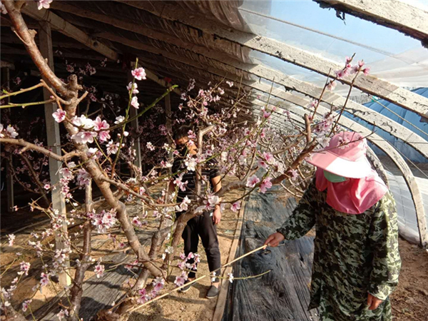 與此同時,在位于江南茶區(qū)郎溪縣的農(nóng)墾十字鋪茶場3萬畝茶園里,茶農(nóng)們正在對茶樹進行修邊、打頭、施肥,著手做好采茶準(zhǔn)備。而在黃河故道旁邊的碭山果園場果樹大棚里,桃花、杏花競相開放,職工正抓緊授粉。種植戶周華萍說,“往年授粉都要雇不少人,今年由于疫情,防止扎堆,沒有雇人,搶抓時間,爭取授上粉,座上果,不減收?!蹦壳肮麍@場800畝大棚果樹大部分已經(jīng)完成授粉工作。