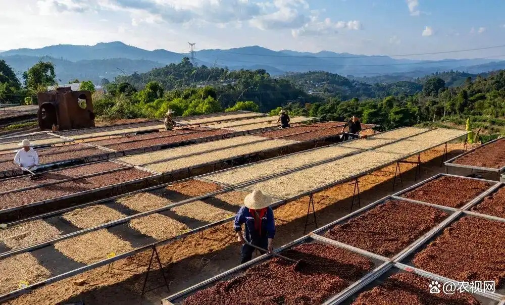 2025年1月7日,工人在普洱市思茅區(qū)一家咖啡莊園翻曬咖啡(無人機(jī)照片)。圖源:新華社