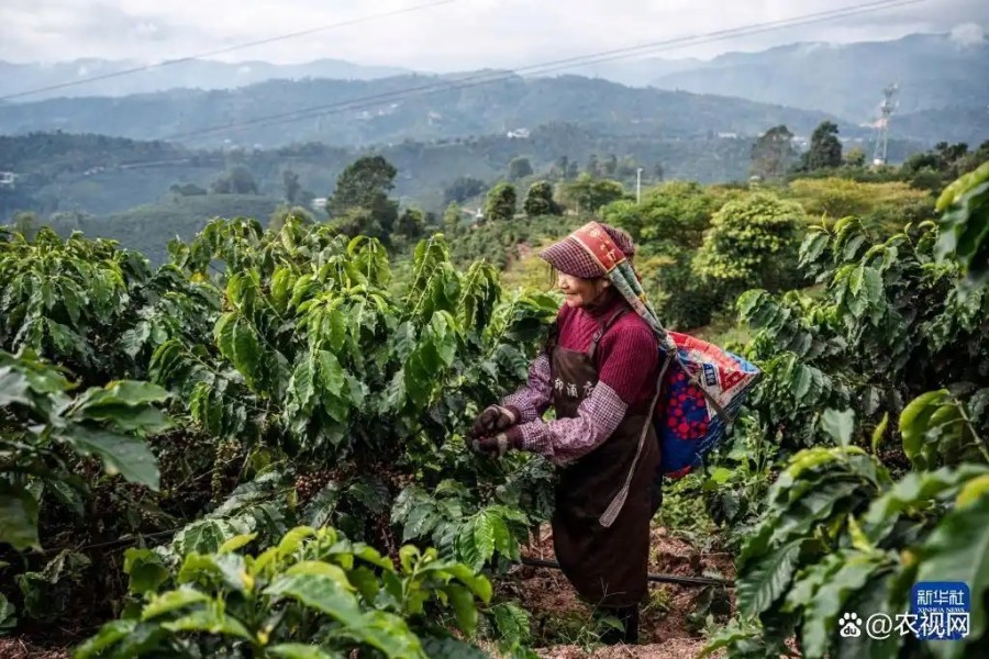 2025年12月6日,農(nóng)民在云南省普洱市一處咖啡田采摘咖啡鮮果。圖源:新華社