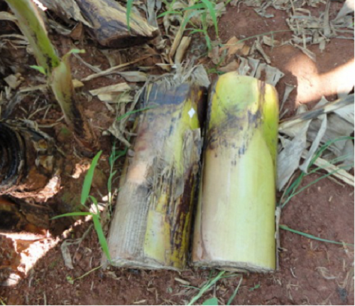 (三)清潔蕉園:經(jīng)常割除香蕉假莖外層腐爛葉鞘,特別是采收香蕉后,砍下的假莖要及時清理,保持蕉園清潔衛(wèi)生,消滅害蟲孳生場所。對已受害的蕉園,砍下帶蟲假莖和舊蕉頭殘體,投入糞坑漚肥,或者縱切成幾份暴曬5天以上將其中的幼蟲殺死。