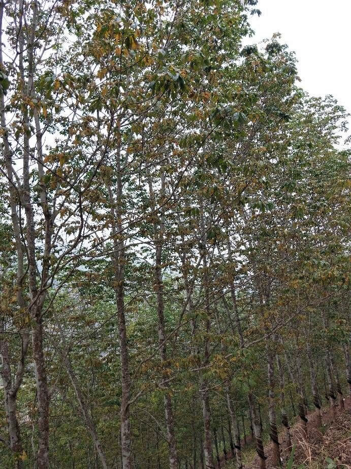 (四)適時(shí)割膠。在嚴(yán)重的旱情還沒有解除之前,避免割膠加劇橡膠樹落葉及其他傷害。對(duì)干旱和白粉病造成橡膠樹落葉的膠園,專家建議橡膠樹新抽嫩葉達(dá)到95 %老化率后20天且旱情緩解方可開割;對(duì)于第一蓬葉量勉強(qiáng)可開割的橡膠林,也應(yīng)推遲開割時(shí)間或降低割膠強(qiáng)度,直到旱情緩解。