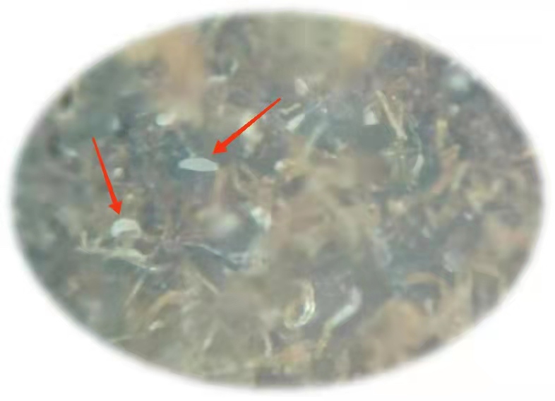 圖2 藏匿于被害部位絨毛間的荔枝癭螨(紅色箭頭所指)