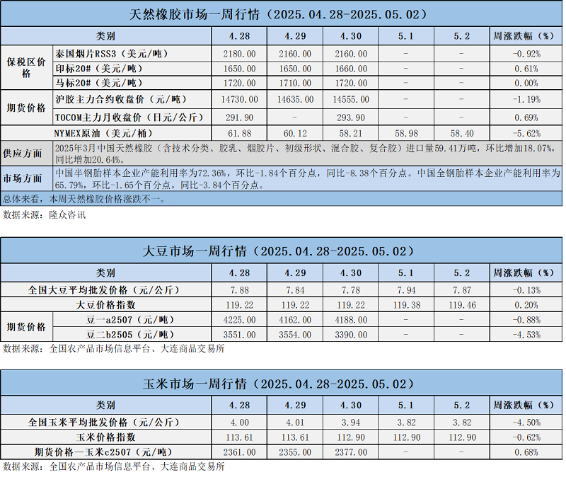 天然橡膠、大豆、玉米市場一周行情(2025.04.28-05.02)