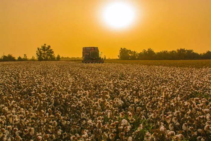 《希望田野》 新疆生產(chǎn)建設(shè)兵團(tuán)第二師鐵門關(guān)市塔里木墾區(qū)33團(tuán)采棉機(jī)在采棉。韓峻 攝