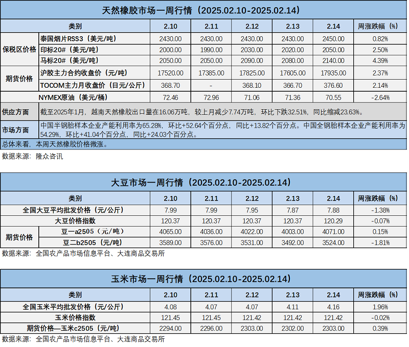 天然橡膠、大豆、玉米市場(chǎng)一周行情(2025.02.10-02.14)