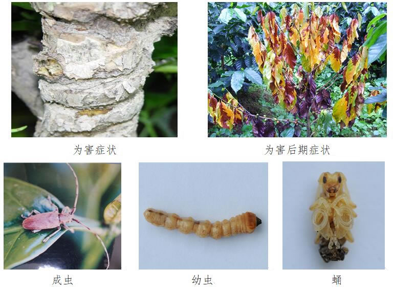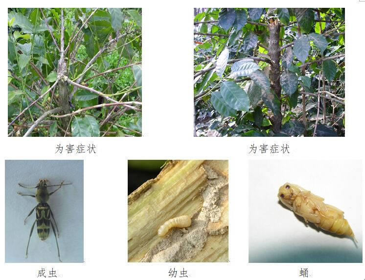 通常以幼蟲鉆蛀咖啡樹干危害木質(zhì)部,主要危害樹齡3年以上,直徑在2.5—3.0cm以上,離地面10—30cm或50—80cm基部樹干或樹干中下部位。被危害樹干內(nèi)幼蟲1—50頭,造成樹干橫向、縱向、或環(huán)向等危害狀,危害株率一般為5%—40%。被害植株在陽光強(qiáng)烈的正午間,辨認(rèn)植株的頂葉、頂芽,若頂葉萎蔫或不正常,即為受害株。被害株受外力易從被害處折斷(見上圖)。成蟲高峰期分別為5月下旬至7月中下旬和9月中下旬至11月上旬。