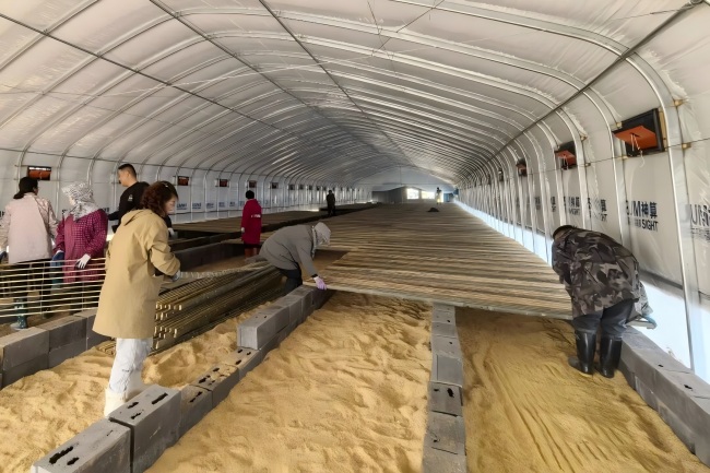 走進(jìn)寬敞規(guī)整的養(yǎng)殖大棚,鋼架結(jié)構(gòu)穩(wěn)固挺拔,松軟稻殼均勻鋪底,整齊水泥磚有序排列成支撐基座,一片片竹排平穩(wěn)鋪設(shè)其上。大家分工協(xié)作、配合默契,搬運(yùn)竹材、定位基座、鋪設(shè)竹排,每一道工序細(xì)致嚴(yán)謹(jǐn)、力求標(biāo)準(zhǔn)規(guī)范?!靶耐惶幭?、勁往一處使,看著鵝群棲息平臺(tái)一步步成型,大家都充滿(mǎn)干勁與成就感。”現(xiàn)場(chǎng)一位工作人員笑著說(shuō)道。