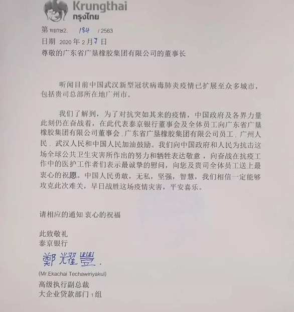 泰京銀行致函廣墾橡膠集團,慰問公司員工,共為中國加油。