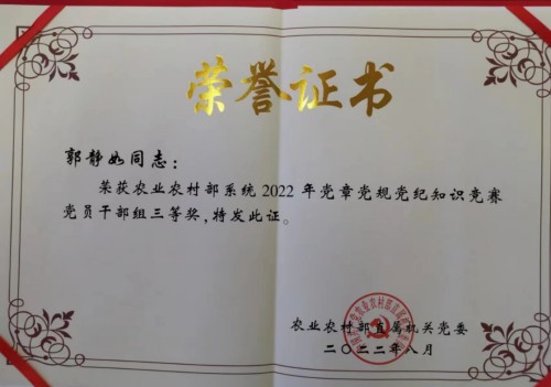 5.郭靜如同志獲農業(yè)農村部系統(tǒng)黨章黨規(guī)黨紀知識競賽黨員干部組三等獎;季剛同志獲旗幟雜志“我想對黨說”征文活動三等獎;張若凡同志獲農業(yè)農村部直屬機關團委“奮進新征程 建功新時代”青年干部學習交流活動優(yōu)秀獎。