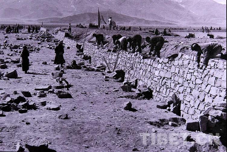 圖為1978年,林周農(nóng)場(chǎng)在修造水平梯田 翻拍:王媛媛