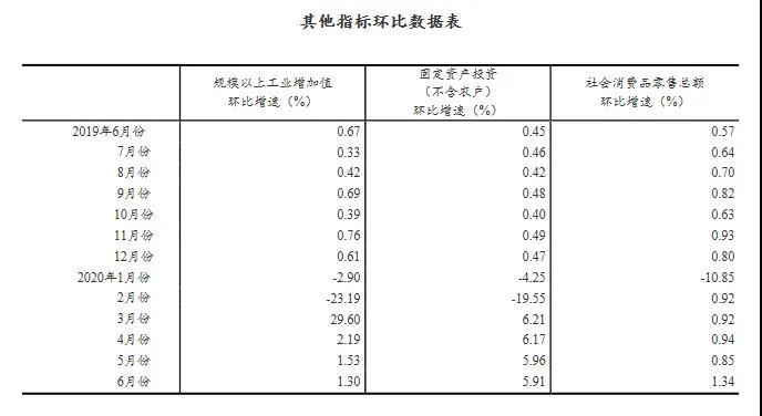 (2)根據(jù)季節(jié)調(diào)整模型自動(dòng)修正結(jié)果,對(duì)近一年來(lái)各期國(guó)內(nèi)生產(chǎn)總值、規(guī)模以上工業(yè)增加值、固定資產(chǎn)投資(不含農(nóng)戶)、社會(huì)消費(fèi)品零售總額環(huán)比增速進(jìn)行修訂。修訂結(jié)果及2020年二季度GDP環(huán)比數(shù)據(jù)、2020年6月份其他指標(biāo)環(huán)比數(shù)據(jù)如下:2019年各季度及2020年一季度、二季度GDP環(huán)比增速分別為2.0%、1.2%、1.4%、1.3%、-10.0%、11.5%。