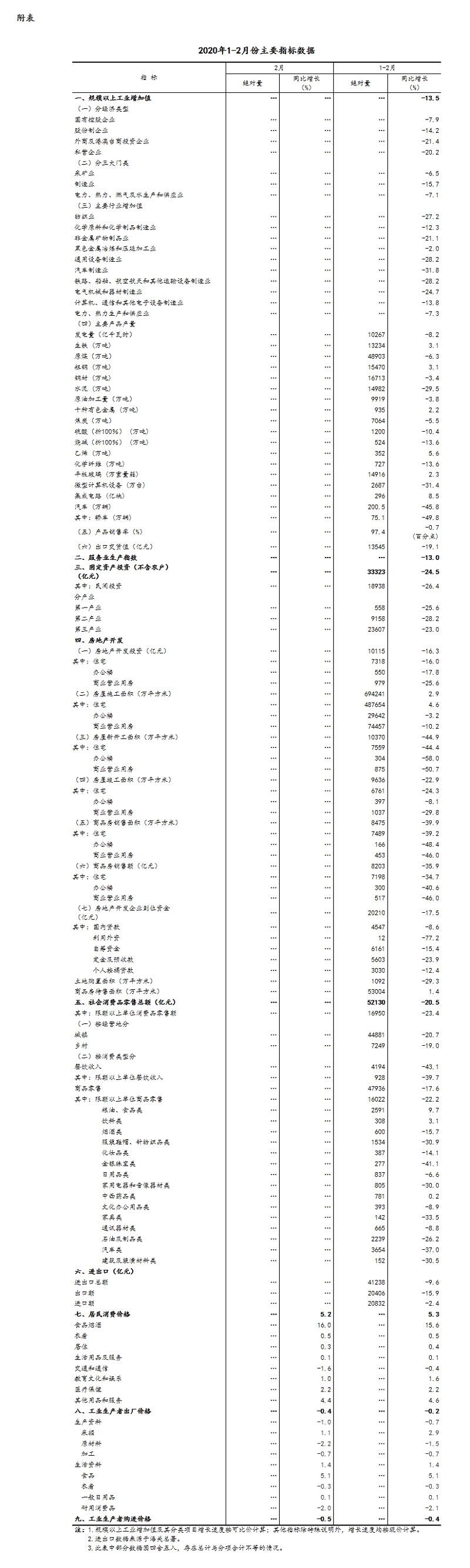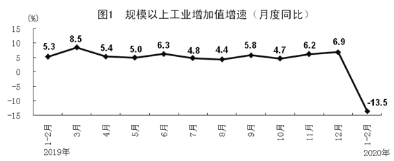 1-2月份,規(guī)模以上工業(yè)增加值同比下降13.5%。分經(jīng)濟(jì)類型看,國有控股企業(yè)增加值下降7.9%;股份制企業(yè)下降14.2%,外商及港澳臺商投資企業(yè)下降21.4%;私營企業(yè)下降20.2%。分三大門類看,采礦業(yè)增加值下降6.5%,制造業(yè)下降15.7%,電力、熱力、燃?xì)饧八a(chǎn)和供應(yīng)業(yè)下降7.1%。從產(chǎn)品產(chǎn)量看,醫(yī)療防護(hù)和生活所需物資增長較快,口罩、發(fā)酵酒精產(chǎn)量分別增長127.5%和15.6%,凍肉和方便面分別增長13.5%和11.4%。高技術(shù)產(chǎn)品增勢良好,智能手表、智能手環(huán)、半導(dǎo)體分立器件和集成電路產(chǎn)量分別增長119.7%、45.1%、31.4%和8.5%。基本原材料生產(chǎn)平穩(wěn),生鐵、粗鋼、平板玻璃、十種有色金屬產(chǎn)量分別增長3.1%、3.1%、2.3%和2.2%。全國采購經(jīng)理調(diào)查數(shù)據(jù)結(jié)果顯示,截至2月25日,大中型制造業(yè)企業(yè)復(fù)工率達(dá)到85.6%,生產(chǎn)經(jīng)營活動正有序恢復(fù)。